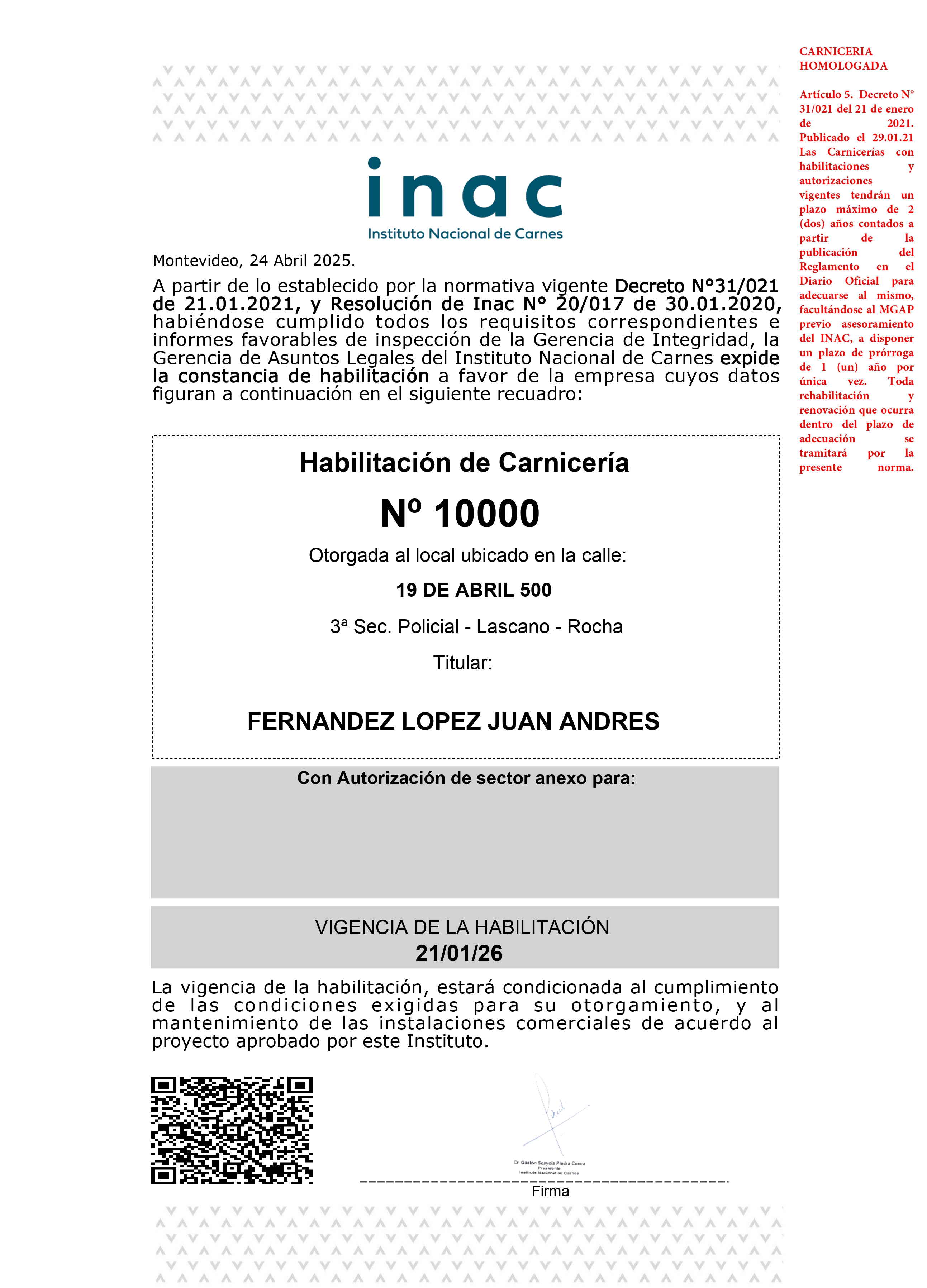 Si tu carnicería o pollería fue homologada por INAC en 2021, esa habilitación vence el 21 de enero de 2026. Ahora debes iniciar el trámite de renovación para seguir operando legalmente. Estás en esta situación si tu Constancia de Habilitación tiene este recuadro rojo: