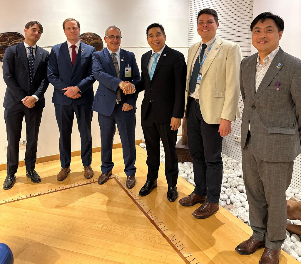 Presidente de INAC saluda a Thanawat Tiensin, Director de la División de Producción y Sanidad Animal de la FAO