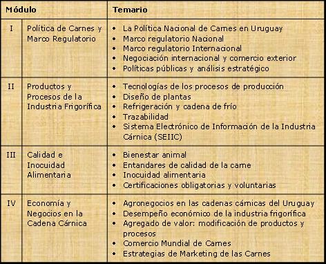 Comprende temas que están directamente vinculados al área de la Ciencia y Tecnología de la Carne, aplicables tanto al mercado interno como a la comercialización externa, ya que integran una lista de requisitos presentes y futuros exigidos por los países compradores. Se abordan temas tales como el "Bienestar Animal", la "Inocuidad Alimentaria" y la "Certificación". El concepto actual de Calidad de las Cadenas Alimentarias tratado en éste módulo, está directamente vinculado a los temas antes citados siendo el proceso de Certificación la herramienta que tiene como objetivo principal maximizar el valor agregado de la carne y productos cárnicos.